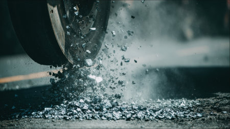 A dynamic close-up shot capturing a tire in motion as it crushes gravel, generating dust clouds and revealing the raw energy and texture of the scene. Perfect for action themes.