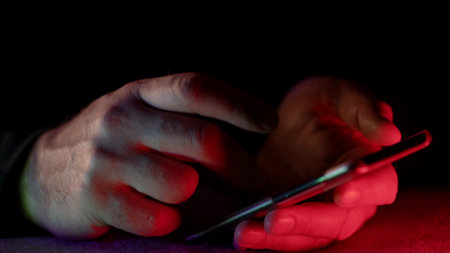 middle-aged man is surfing internet by mobile phone, closeup of hands in darkness