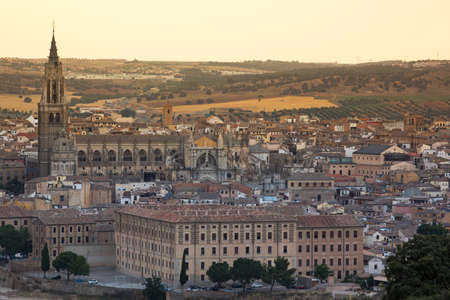 Cityscape of Toledo with its old buildings and churches, showing the architectural heritage bathed in the warm evening light.
