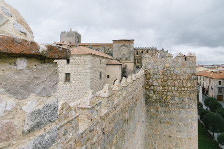 Avila, Spain - November 11, 2014: The Medieval Walls of Avila and the Cathedral. The old city and its extramural churches