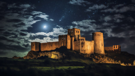 castle on a hill at full moon, realistic illustration