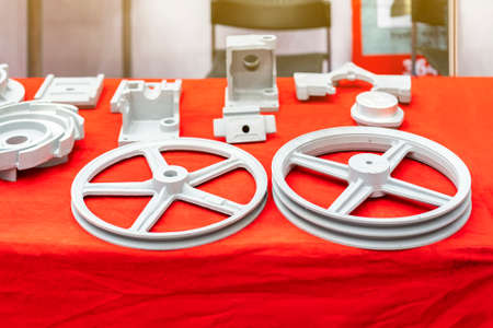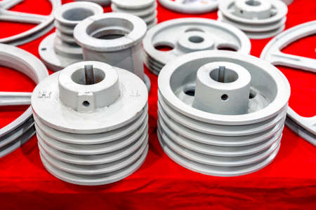 iron casting industrial parts pulley for transmission power to automotive engine pump or blower casting by green sand or shell mold process on red table and etc.
