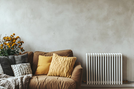 Comfortable living room featuring a white radiator for home heating, a brown sofa with textured cushions, and yellow flowers for a cozy, inviting atmosphere.