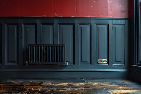 Vintage interior design featuring a red and blue room with classic wainscoting, a black radiator, and distressed wooden floors. the space showcases a blend of traditional and modern elements, making it ideal for design inspiration or architectural studies. Generative AI