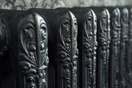 A black radiator with intricate designs on it. The radiator is old and has a vintage look to it. The designs on the radiator are ornate and detailed, giving it a sense of elegance and sophistication