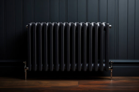 A classic black radiator against a gray wall, placed on a wooden floor, showcasing a clean and modern home interior. The radiator is central to heating in cooler climates
