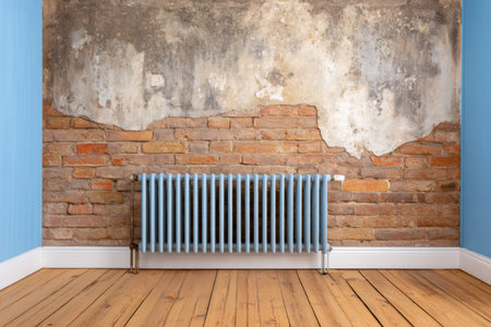 Light blue radiator stands in an empty room with a partially exposed brick wall, blending modern and rustic elements