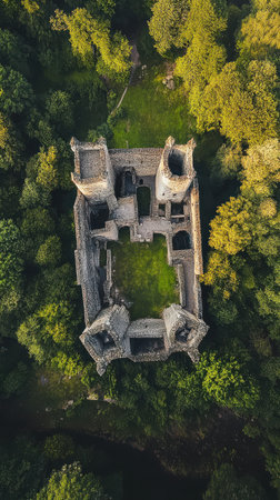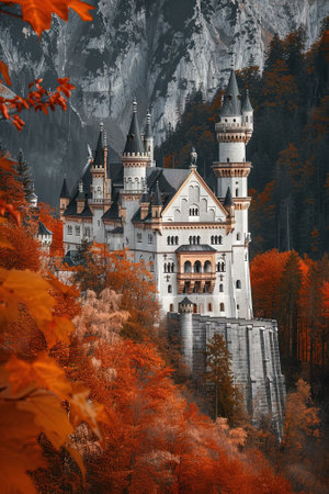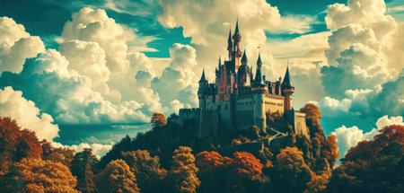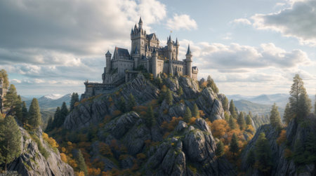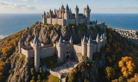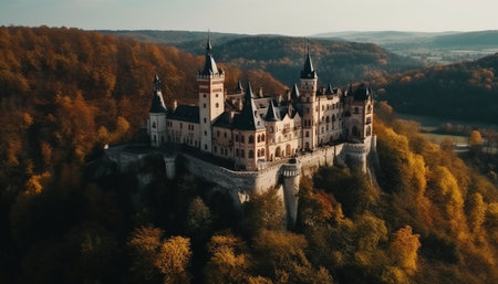 An aerial shot capturing a majestic castle perched on a hilltop surrounded by vibrant autumn foliage, the picturesque scene evokes a sense of wonder and timelessness.
