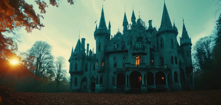 A dark, eerie castle stands tall with its pointed towers, surrounded by a barren landscape on Halloween night, evoking a sense of mystery and fear.