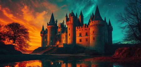 Fantasy landscape with medieval castle at sunset.