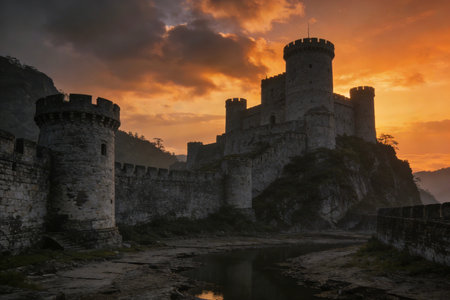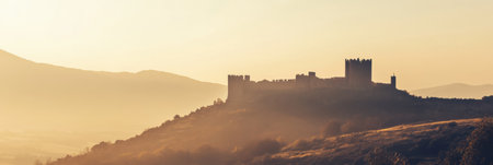 An ancient castle perched on a hilltop offers breathtaking views of misty valleys as the sun sets behind distant mountains.