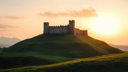 Under a stunning sunset sky, a medieval castle stands majestically on a green hill, bathed in warm colors of twilight.