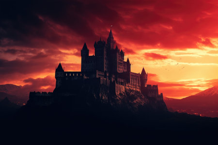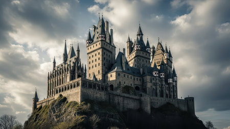 Majestic gothic castle on hill against dramatic sky.