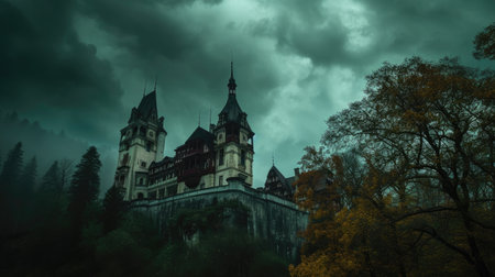 A majestic ancient architectural castle in gloomy weather during autumn, a castle with a high and sharp dome.