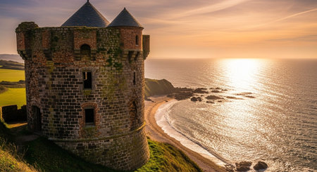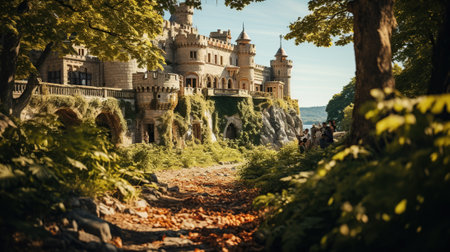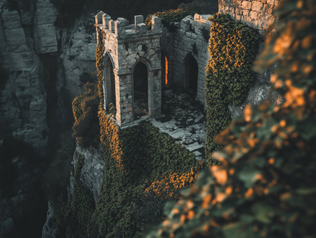 A majestic ancient castle, partially covered in lush green vines, sits on the edge of a cliff surrounded by rolling hills and bathed in warm golden sunlight