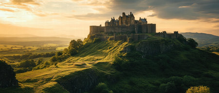Cinematic view of a historical castle on a hilltop at sunset overlooking a lush landscape