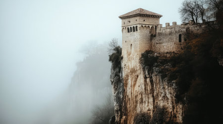 This captivating image showcases a medieval castle tower perched dramatically on a rocky cliff, shrouded in mystical fog. The blend of nature and history creates a serene yet intriguing atmosphere, perfect for transporting viewers to a bygone era.
