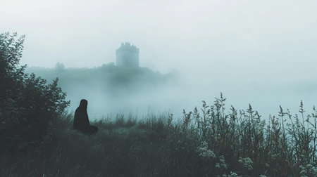 A contemplative figure sits silently by a fog-covered lake, with an ancient castle looming in the background. The scene evokes mystery and tranquility.