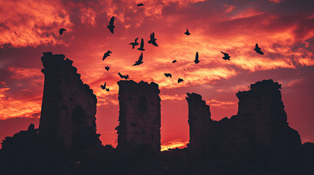 A stunning silhouette of ancient ruins against a vibrant sunset sky, filled with flying birds. This dramatic scene evokes a sense of history and beauty.