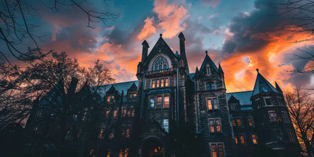 Dramatic sunset over a haunted building in Boston, Massachusetts.
