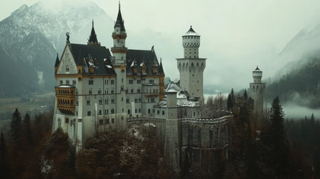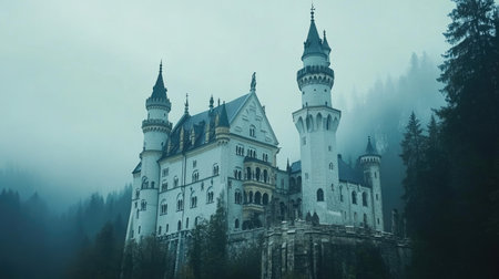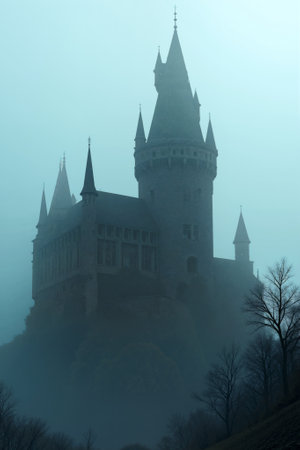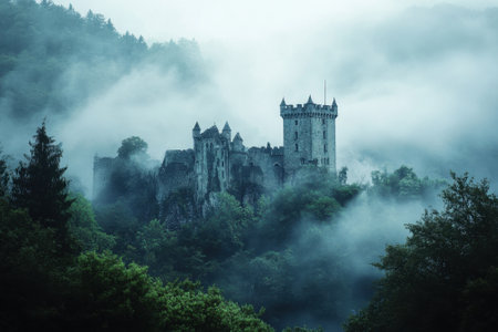 Majestic Castle Shrouded in Fog Overlooking a Quiet Landscape at Dawn