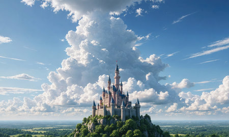 A majestic castle sits atop a green hill, overlooking a sprawling landscape on a sunny day