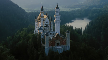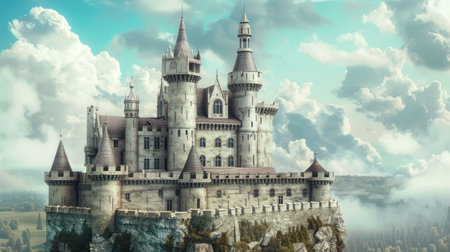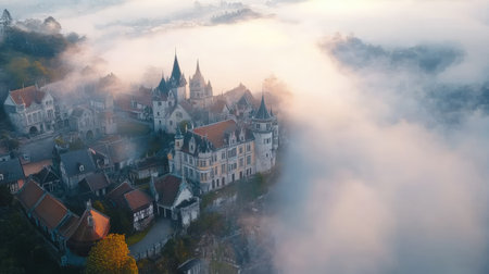 Aerial view of an enchanting castle surrounded by mist and fog. The scene captures nature's beauty at dawn, evoking a magical and serene atmosphere.