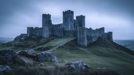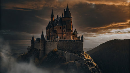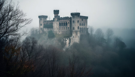Majestic ancient castle perched atop a rugged hill, surrounded by dense fog and dramatic lighting