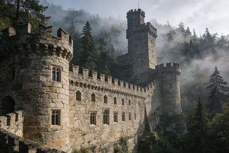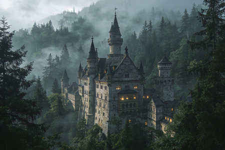 An ancient castle stands shrouded in mist, surrounded by dense green trees in the early morning light.
