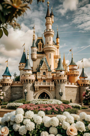 Whimsical fairytale castle background with turrets and medieval architecture.