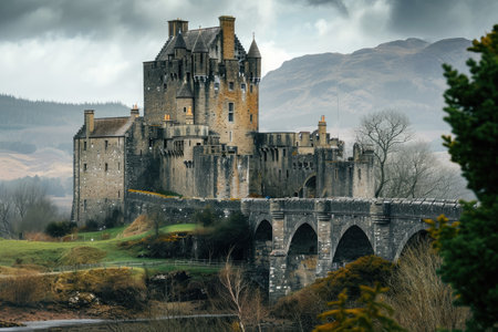 Majestic Castle With Sturdy Bridge Standing Tall Amidst Natures Beauty, A medieval castle, complete with drawbridge and moat, nestled in rolling hills, AI Generated