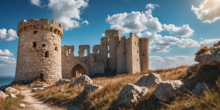 AI Generated. Ruins of a medieval castle by the seaside under a clear blue sky with fluffy clouds
