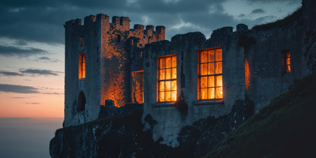 AI Generated. Warm light emanating from the windows of an old stone castle perched on a cliff at twilight