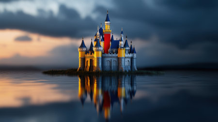 A castle is floating on a body of water. The castle is surrounded by a calm, still body of water. The castle is a symbol of power and grandeur