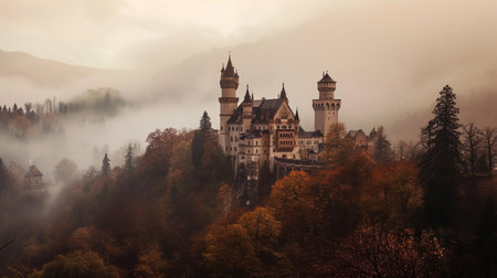 Misty autumn scenery with a fairy tale castle surrounded by colorful forest.