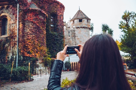 Young and happy tourist woman making photo of old castle