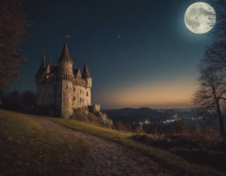 castle on a hill at full moon, realistic illustration