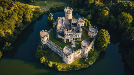 An aerial perspective showcases a picturesque medieval castle, nestled on an island amid a vibrant green moat, illuminated by soft light, evoking a sense of history and tranquility.