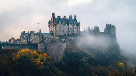 Explore the enchanting beauty of Edinburgh Castle, a historic fortress perched atop a hill, shrouded in mist with vibrant autumn foliage, creating a mesmerizing landscape.