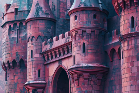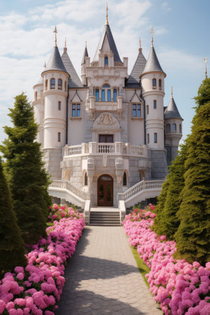 he exterior of a pink princess castle reveals intricate details and stunning architecture.