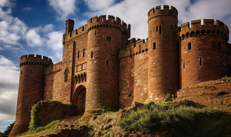 A large brick castle proudly stands on top of a hill, showcasing its grandeur and historical significance.
