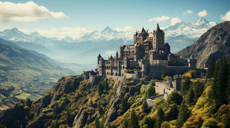 Castle on hill with mountain in the back. Generative AI.