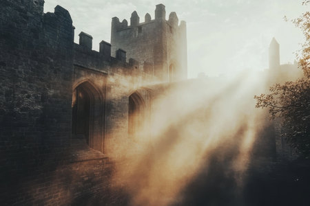 Rays of golden sunlight penetrate the mist surrounding an ancient castle, creating a mystical atmosphere at dawn.