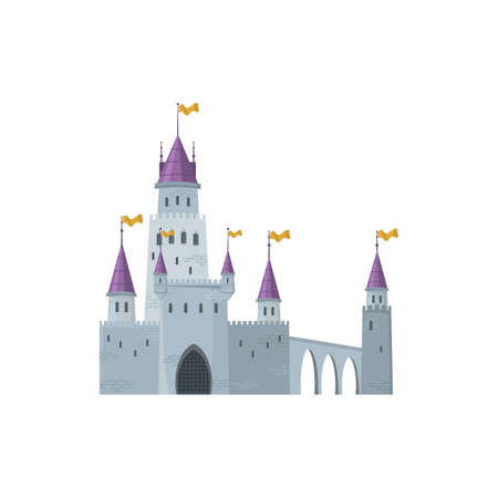 Medieval castle isolated cartoon queen or king palace with towers, gates and flag. Vector cinderella fantasy fort with bridge, purple roof, gray stony building. Royal fortress of prince princess