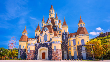 Lembang, September 2 2024. A grand castle resembling Disneyland, with towering spires and intricate details, creating a magical and majestic atmosphere