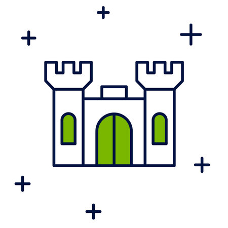 Line Castle icon isolated on black background. Medieval fortress with a tower. Protection from enemies. Reliability and defense of the city. Flat filled outline style with shadow. Vector.