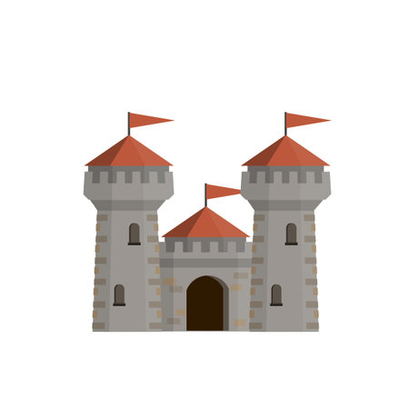 Medieval European stone castle. Knights fortress. Concept of security, protection and defense. Cartoon flat illustration. Military building with walls, gates and big tower.