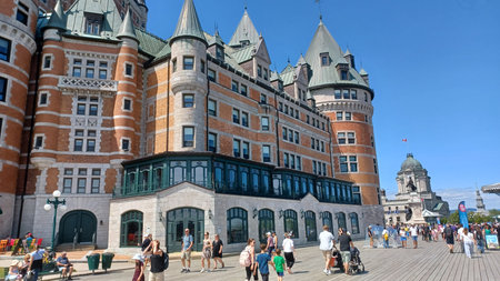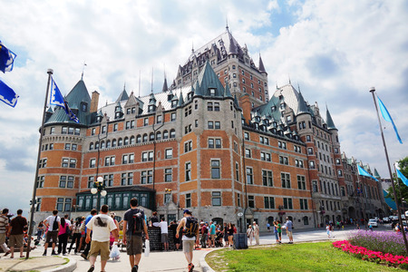 QUEBEC CITY, CANADA - JULY, 20: Tourists visiting the Chateau Frontenac in Old Quebec city, Canada on July 20, 2014. Located right above the St.Lawrence river, the Chateau is one of the most visited and well known landmark in Quebec.