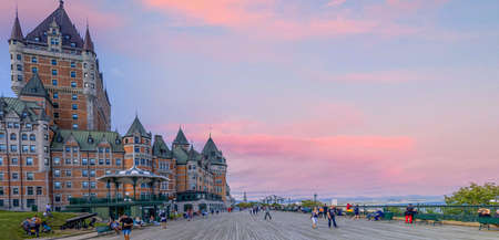 Quebec City, Quebec, Canada, 20 September, 2021: Famous Chateau Frontenac in Quebec historic center located on Dufferin Terrace promenade with scenic views and landscapes of Saint Lawrence River
