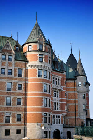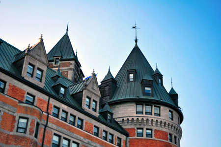 Detail of Chateau Frontenac Hotel in Quebec City, Ontario, Canada against a blue summer sky. The first version of this castle like hotel was designed by architect Bruce Price and opened to public in 1893. Later it was enlarged and the central tower was ad